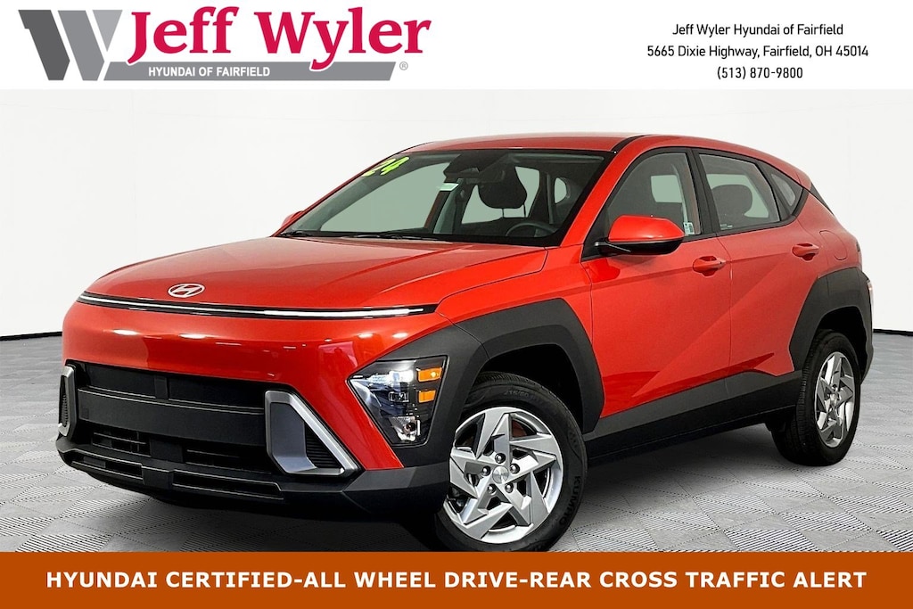 CARFAX One-Owner. Jeff Wyler Hyundai of Fairfield is pleased to offer this fantastic-looking 2024 Hyundai Kona SE in Soultronic Orange Pearl. Well equipped with: Option Group 01, Hyundai Certified Used Vehicles Certified, Android Auto, Apple CarPlay, CALL NOW FOR YOUR VIP APPOINTMENT 513-870-9800, FULLY SERVICED w/RECORDS, GUARANTEED FINANCING!! NO MATTER YOUR SITUATION WE CAN GET AN APPROVAL!!, THE #1 Volume dealer in the region! Come see why for yourself Today!!, WE PAY MORE FOR YOUR TRADE!!, 4-Wheel Disc Brakes, 6 Speakers, 6.052 Axle Ratio, ABS brakes, Air Conditioning, Alloy wheels, AM/FM radio: SiriusXM, Apple CarPlay & Android Auto, Auto High-beam Headlights, Automatic temperature control, Brake assist, Bumpers: body-color, Carpeted Floor Mats, Cloth Seat Trim, Delay-off headlights, Driver door bin, Driver vanity mirror, Dual front impact airbags, Dual front side impact airbags, Electronic Stability Control, Emergency communication system: Bluelink+, Exterior Parking Camera Rear, Four wheel independent suspension, Front anti-roll bar, Front Bucket Seats, Front Center Armrest, Front reading lights, Fully automatic headlights, Illuminated entry, Low tire pressure warning, Occupant sensing airbag, Outside temperature display, Overhead airbag, Panic alarm, Passenger door bin, Passenger vanity mirror, Power door mirrors, Power steering, Power windows, Radio: AM/FM/HD Radio/SiriusXM Audio System, Rear anti-roll bar, Rear seat center armrest, Rear window defroster, Rear window wiper, Remote keyless entry, Security system, Speed control, Speed-sensing steering, Split folding rear seat, Spoiler, Steering wheel mounted audio controls, Tachometer, Telescoping steering wheel, Tilt steering wheel, Traction control, Trip computer, Variably intermittent wipers, and Wheels: 17" x 7.0J Steel Gray Alloy. Certified. Hyundai Certified Used Vehicles Details: * 173+ Point Inspection * Limited Warranty: 60 Month/60,000 Mile (whichever comes first) from original in-service date * Roadside Assistance * Includes 10-year/Unlimited Mileage Roadside Assistance with Rental Car and Trip Interruption Reimbursement; Please See Dealers for Specific Vehicle Eligibility Requirements. 10-Year/100,000 Mile Hybrid/EV Battery Warranty. 3-Months SiriusXM Trial Subscription. Complimentary 1 Year (Connected Care & Remote Pkgs). * Powertrain Limited Warranty: 120 Month/100,000 Mile (whichever comes first) from original in-service date * Vehicle History * Warranty Deductible: $50TO CHECK ON THE AVAILABILITY OF THIS VEHICLE REACH OUT TO ONE OF OUR TEAM MEMBERS!! ALSO SHOP ONLINE AT https://www.jeffwylerhyundaioffairfield.com/ Proudly Serving: Cincinnati, Dayton, Columbus, Louisville, Lexington, Indianapolis, Hamilton, Florence, Alexandria, Beavercreek, Springdale, West Chester, Monroe, Fairfield, Kenwood, Newport and all of greater Cincinnati Ohio, Indiana, and Northern Kentucky.