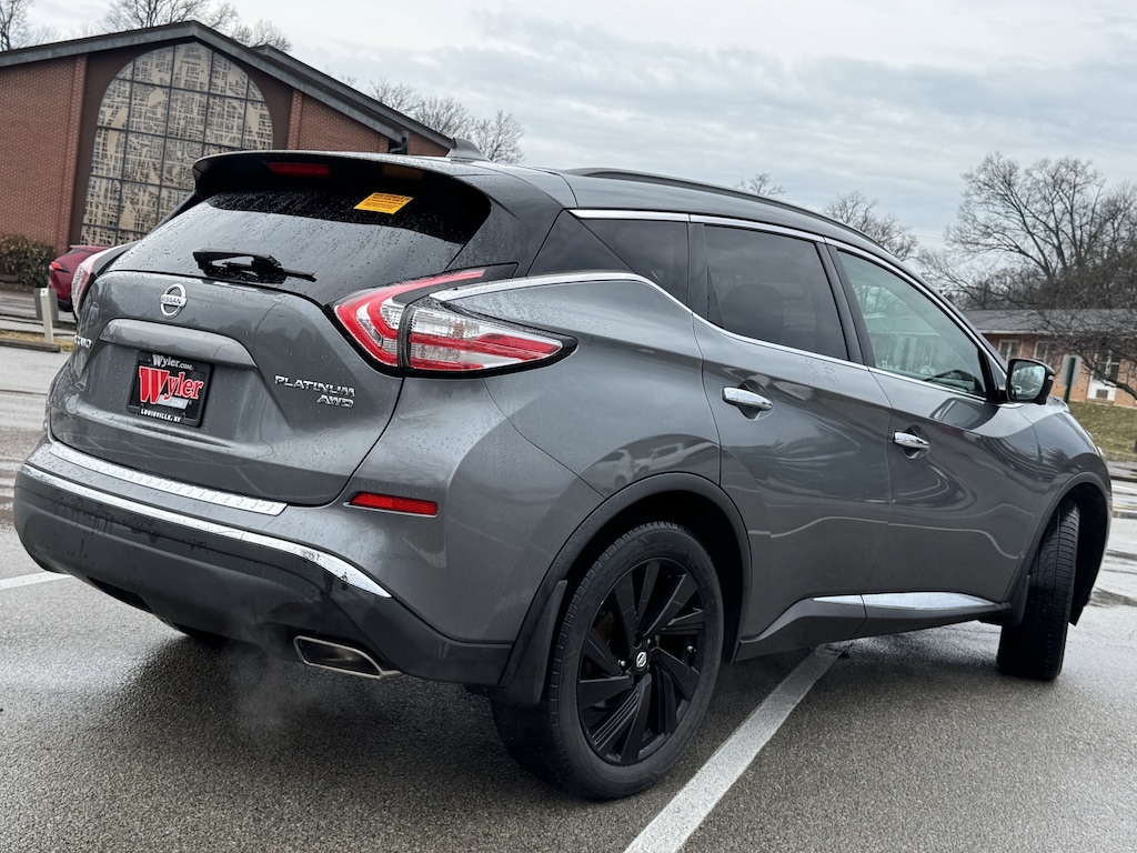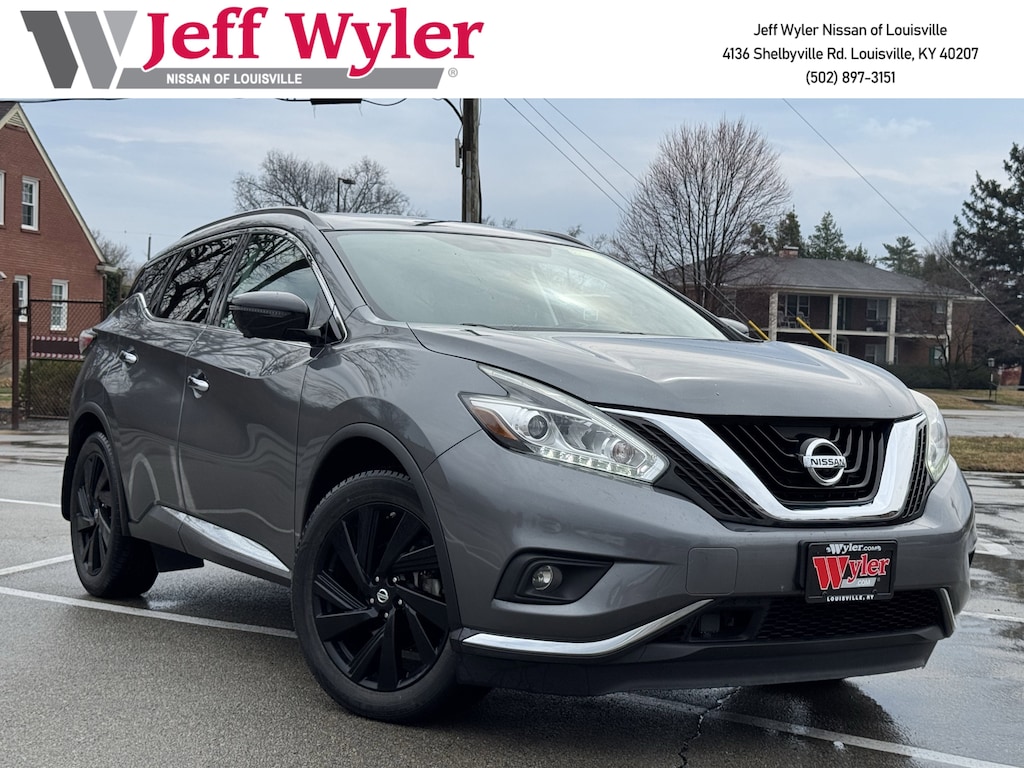 Jeff Wyler Nissan of Louisville is delighted to offer this great-looking 2017 Nissan Murano Platinum in Gun Metallic. ** NISSAN CERTIFIED PRE-OWNED **, ** ONE-OWNER CARFAX **, ** CLEAN CARFAX REPORT **, ** BLUETOOTH **, ** NAVIGATION **, ** SUNROOF/MOONROOF **, ** BACKUP CAMERA **, ** LEATHER INTERIOR **, ** HEATED SEATS **, ** PUSH-BUTTON START **, ** 6-CYLINDER ENGINE **, ** EXCELLENT SERVICE HISTORY **, ** LOCALLY OWNED **, and ** HOME DELIVERY OPTIONS! ** Cargo Package (Cargo Area Protector, Cargo Net, and Retractable Cargo Cover), Midnight Edition (Black Mirror Caps, Black Roof Rails, Black Splash Guards, and Wheels: 20" Midnight Black Aluminum-Alloy), Platinum Technology Package (Intelligent Cruise Control and Predictive Forward Collision Warning (PFCW)), Nissan Certified Pre-Owned Certified, CVT with Xtronic, AWD, 11 Speakers, 4-Wheel Disc Brakes, 4.677 Axle Ratio, ABS brakes, Air Conditioning, Alloy wheels, AM/FM radio: SiriusXM, Anti-whiplash front head restraints, Auto-dimming Rear-View mirror, Automatic temperature control, Blind Spot Warning, Brake assist, Bumpers: body-color, CD player, Compass, Delay-off headlights, Driver door bin, Driver vanity mirror, Dual front impact airbags, Dual front side impact airbags, Electronic Stability Control, Emergency communication system: NissanConnect Services, Four wheel independent suspension, Front anti-roll bar, Front Bucket Seats, Front Center Armrest w/Storage, Front dual zone A/C, Front fog lights, Front reading lights, Fully automatic headlights, Garage door transmitter: HomeLink, Heated & Cooled Front Bucket Seats, Heated door mirrors, Heated front seats, Heated rear seats, Heated steering wheel, Illuminated entry, Illuminated Kick Plates Accessory (DISC), Knee airbag, Leather Shift Knob, Leather-Appointed Seat Trim, Low tire pressure warning, Memory seat, Midnight Edition Carpeted Floor Mats, Navigation System, NissanConnect Services Powered By SiriusXM, Occupant sensing airbag, Outside temperature display, Overhead airbag, Overhead console, Panic alarm, Passenger door bin, Passenger vanity mirror, Power door mirrors, Power driver seat, Power Liftgate, Power passenger seat, Power steering, Power windows, Radio data system, Radio: AM/FM/CD Audio System w/Navigation, Rear anti-roll bar, Rear Bumper Protector, Rear reading lights, Rear seat center armrest, Rear window defroster, Rear window wiper, Remote keyless entry, Roof rack: rails only, Security system, Speed control, Speed-sensing steering, Speed-Sensitive Wipers, Split folding rear seat, Spoiler, Steering wheel memory, Steering wheel mounted audio controls, Tachometer, Telescoping steering wheel, Tilt steering wheel, Traction control, Trip computer, Turn signal indicator mirrors, Variably intermittent wipers, Ventilated front seats, and Wheels: 20" Machined Aluminum-Alloy Our PRE-OWNED vehicles are put through a rigorous 167- POINT QUALITY ASSURANCE INSPECTION along with an average amount of over $1,400.00 SPENT to recondition each vehicle so we can be sure to deliver you the highest quality vehicle like you deserve! ***ONLINE PRICE DOES NOT INCLUDE WYLER FAMILY FIRST PACKAGE*** Stop by 4136 Shelbyville Road to see for yourself, or give us a call @ 502-897-3151 to schedule your test drive! ** NISSAN CERTIFIED PRE-OWNED **, ** ONE-OWNER CARFAX **, ** CLEAN CARFAX REPORT **, ** BLUETOOTH **, ** NAVIGATION **, ** SUNROOF/MOONROOF **, ** BACKUP CAMERA **, ** LEATHER INTERIOR **, ** HEATED SEATS **, ** PUSH-BUTTON START **, ** 6-CYLINDER ENGINE **, ** EXCELLENT SERVICE HISTORY **, ** LOCALLY OWNED **, CVT with Xtronic, AWD.