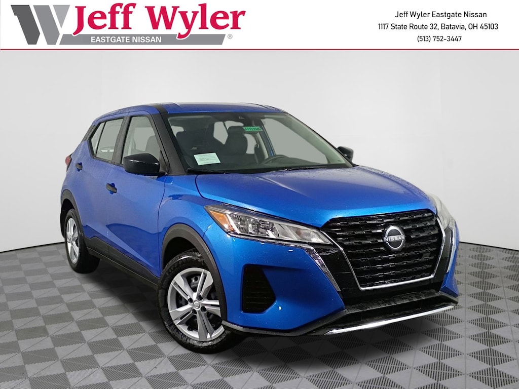 Electric Blue Metallic 2025 Nissan Kicks Play S 1.6L 4-Cylinder DOHC 16V FWD CVT with Xtronic 31/36 City/Highway MPG Jeff Wyler Eastgate Auto Mall is pumped up to offer this stunning 2025 Nissan Kicks Play S in Electric Blue Metallic. Well equipped with: 16" Steel Wheels w/Full Covers, 6 Speakers, ABS brakes, Air Conditioning, AM/FM radio, Apple CarPlay/Android Auto, Auto High-beam Headlights, Blind Spot Warning, Brake assist, Bumpers: body-color, Carpeted Floor Mats w/Cargo Mat, Center Armrest w/Storage, Cloth Seat Trim w/Single Stitch, Driver door bin, Driver vanity mirror, Driver's Seat Mounted Armrest, Dual front impact airbags, Dual front side impact airbags, Electronic Stability Control, Front anti-roll bar, Front Bucket Seats, Front reading lights, Front wheel independent suspension, Fully automatic headlights, Illuminated entry, Knee airbag, Low tire pressure warning, Occupant sensing airbag, Outside temperature display, Overhead airbag, Panic alarm, Passenger door bin, Passenger vanity mirror, Power door mirrors, Power steering, Power windows, Radio data system, Radio: AM/FM Audio System, Rear Parking Sensors, Rear reading lights, Rear side impact airbag, Rear window defroster, Rear window wiper, Remote keyless entry, Speed control, Splash Guards Grain (4 Piece), Split folding rear seat, Sport steering wheel, Steering wheel mounted audio controls, Tachometer, Telescoping steering wheel, Tilt steering wheel, Traction control, Trip computer, and Variably intermittent wipers. 31/36 City/Highway MPG