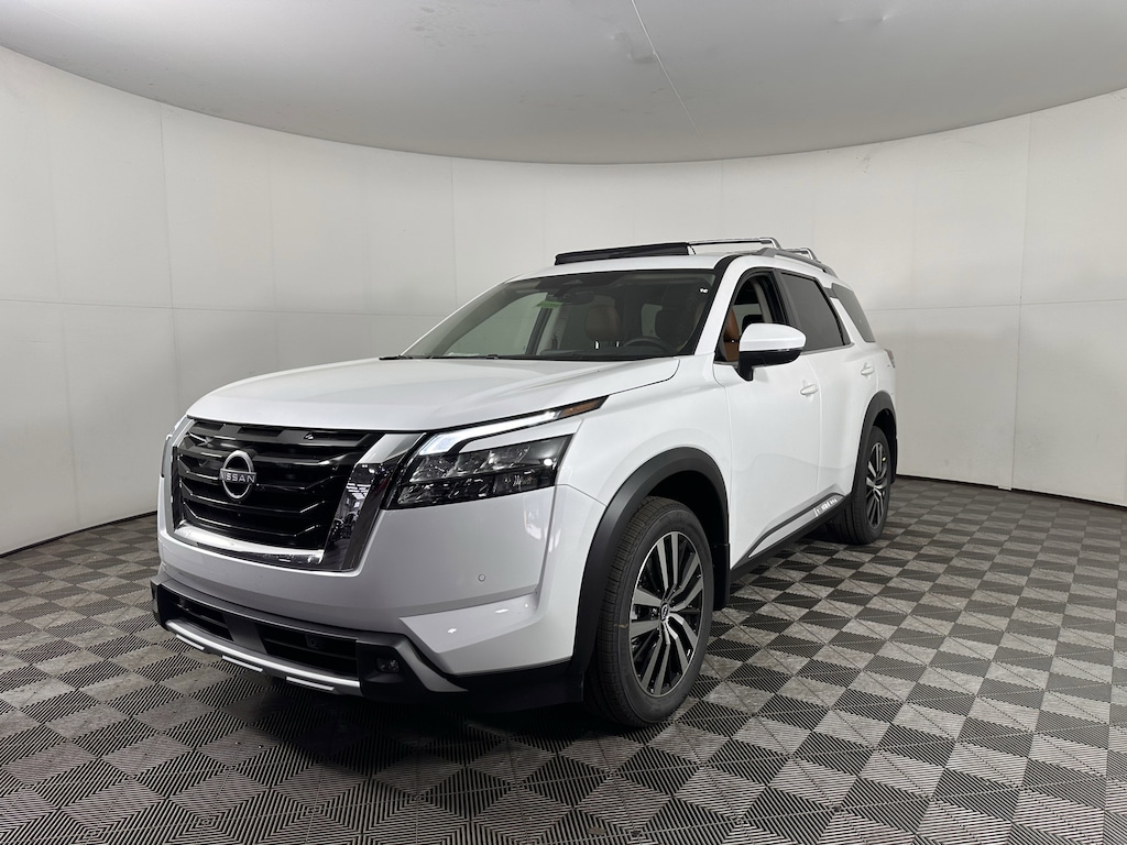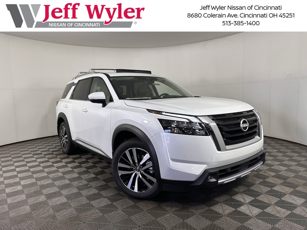 Everest White Pearl Tricoat 2025 Nissan Pathfinder Platinum 4WD 9-Speed Automatic Jeff Wyler Nissan of Cincinnati is delighted to offer this attractive 2025 Nissan Pathfinder Platinum in Everest White Pearl Tricoat. Well equipped with: Cargo Package (Cargo Area Protector, Cargo Net, and First Aid), 4WD, 13 Speakers, 3rd row seats: bench, 4-Wheel Disc Brakes, ABS brakes, Air Conditioning, Alloy wheels, AM/FM radio: SiriusXM, Auto High-beam Headlights, Auto tilt-away steering wheel, Auto-dimming Rear-View mirror, Automatic temperature control, Bench Seat Carpeted Floor Mats (Set of 4), Bodyside moldings, Bose Premium Audio System, Brake assist, Bumpers: body-color, Climate Controlled Front Bucket Seats, Cross Bars, Delay-off headlights, Driver door bin, Driver vanity mirror, Dual front impact airbags, Dual front side impact airbags, Electronic Stability Control, Emergency communication system, Exterior Parking Camera Rear, Four wheel independent suspension, Front anti-roll bar, Front Bucket Seats, Front Center Armrest, Front dual zone A/C, Front reading lights, Fully automatic headlights, Garage door transmitter: HomeLink, Heads-Up Display, Heated door mirrors, Heated front seats, Heated rear seats, Heated steering wheel, Illuminated entry, Knee airbag, Leather steering wheel, LED Fog Lamps, Low tire pressure warning, Memory seat, Navigation system: NissanConnect with Navigation and Services, NissanConnect featuring Apple CarPlay and Android Auto, NissanConnect w/Navigation & Services, Occupant sensing airbag, Outside temperature display, Overhead airbag, Overhead console, Panic alarm, Passenger door bin, Passenger vanity mirror, Power door mirrors, Power driver seat, Power Liftgate, Power moonroof, Power passenger seat, Power steering, Power windows, Radio data system, Radio: AM/FM Audio System, Rain sensing wipers, Rear air conditioning, Rear anti-roll bar, Rear reading lights, Rear seat center armrest, Rear side impact airbag, Rear window defroster, Rear window wiper, Reclining 3rd row seat, Remote keyless entry, Security system, Semi-Aniline Leather-Appointed Seating Surfaces, Speed control, Speed-sensing steering, Speed-Sensitive Wipers, Split folding rear seat, Spoiler, Steering wheel memory, Steering wheel mounted audio controls, Tachometer, Telescoping steering wheel, Tilt steering wheel, Traction control, Trip computer, Turn signal indicator mirrors, Variably intermittent wipers, Ventilated front seats, and Wheels: 20" x 8J Machined Alloy. 3.5L V6 DOHC 4WD.Recent Arrival!Wyler Family First Package Includes: NanoCure Appearance Protection: Exterior & Interior Chemical Sealant Applied to Protect Against Environmental Hazards (7 Year Warranty Coverage). Pulse- Rear end Collision Avoidance System Theft Deterrent Strategy gives you 5 Years of Coverage against vehicle Theft, Offering up to a $5,000 benefit. Price includes: $5000 - Nissan Customer Cash. Exp. 11/03/2025