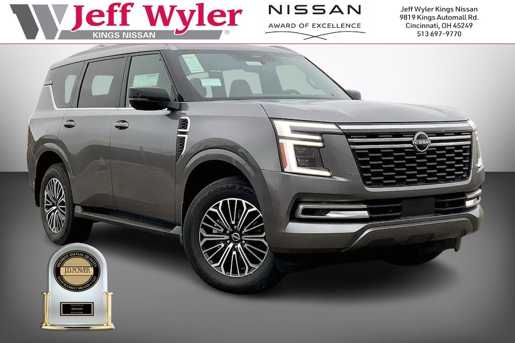 $5,765 off MSRP! Jeff Wyler Kings Nissan is proud to offer this stunning-looking 2026 Nissan Armada SL in Gun Metallic. Well equipped with: Captain's Chair Seat Package (2nd Row Center Console with Two Cupholders, 2nd Row Outboard Captain's Chairs with Armrests, and EZ Flex Second Row Seating System with One Touch Release), ProPILOT Assist 2.1 (3D Around View Monitor, Ambient Lighting with Multicolor Illumination, and Heads-Up Display), 4WD, 12 Speakers, 3rd row seats: split-bench, 4-Wheel Disc Brakes, ABS brakes, Air Conditioning, Alloy wheels, AM/FM radio: SiriusXM w/360L, Anti-whiplash front head restraints, Apple CarPlay/Android Auto, Auto High-beam Headlights, Auto tilt-away steering wheel, Auto-dimming door mirrors, Auto-dimming Rear-View mirror, Auto-leveling suspension, Automatic temperature control, Brake assist, Bumpers: body-color, Carpeted Floor Mats with Captain Chairs, Center Front Spoiler, Compass, Cross Bars, Delay-off headlights, Driver door bin, Driver vanity mirror, Dual front impact airbags, Dual front side impact airbags, Electronic Stability Control, Emergency communication system: NissanConnect Services, Four wheel independent suspension, Front anti-roll bar, Front Bucket Seats, Front Center Armrest, Front dual zone A/C, Front reading lights, Fully automatic headlights, Garage door transmitter: myQ Connected Garage, Genuine wood dashboard insert, Heated door mirrors, Heated Front Bucket Seats, Heated front seats, Heated steering wheel, HVAC memory, Illuminated entry, Knee airbag, Leather steering wheel, Low tire pressure warning, Memory seat, Navigation system: Google Maps, Occupant sensing airbag, Outside temperature display, Overhead airbag, Overhead console, Panic alarm, Passenger door bin, Passenger vanity mirror, Power door mirrors, Power driver seat, Power Liftgate, Power passenger seat, Power steering, Power windows, Radio: NissanConnect with SiriusXM 360L, Rain sensing wipers, Rear air conditioning, Rear anti-roll bar, Rear Bumper Protector, Rear reading lights, Rear seat center armrest, Rear window defroster, Rear window wiper, Reclining 3rd row seat, Remote keyless entry, Security system, Speed control, Speed-sensing steering, Speed-Sensitive Wipers, Splash Guards, Split folding rear seat, Spoiler, Steering wheel memory, Steering wheel mounted audio controls, Tachometer, TailorFit Seat Trim, Telescoping steering wheel, Tilt steering wheel, Traction control, Trip computer, Turn signal indicator mirrors, Variably intermittent wipers, Voltmeter, and Wheels: 20" x 8.5J Machined and Painted Alloy.Wyler Family First Package Includes: NanoCure Appearance Protection: Exterior & Interior Chemical Sealant Applied to Protect Against Environmental Hazards (7 Year Warranty Coverage). Pulse- Rear end Collision Avoidance System Theft Deterrent Strategy gives you 5 Years of Coverage against vehicle Theft, Offering up to a $5,000 benefit. Used vehicles 10 years of age or newer with less than 100,000 miles are eligible for the Wyler Assurance Program, but eligible vehicles must pass our reconditioning process and multi-point inspection. Provided the vehicle passes inspection, vehicles will be eligible for the 6 month/6,000 mile limited warranty. The 6 month/6,000 mile limited warranty is NOT available on AS-IS vehicles, wholesale vehicles, lease buyback/pass-thru vehicles or un-inspected vehicles. Note that this program can also apply to vehicles where the remaining factory coverage is less than 6 months or 6,000 miles. Please check the Federal Trade Commission (FTC) Buyers guide on the vehicle for full details as to whether or not warranty coverage may apply. Contact Dealer for additional details. The Wyler Assurance 6 month/6,000 Mile limited warranty ends 6 months from the date of the Retail Purchase Agreement (BUYERS ORDER) or when the vehicle's odometer registers 6,000 additional miles to the mileage listed on the BUYERS ORDER, whichever comes first. Your Deductible - The warranty holder on your cont