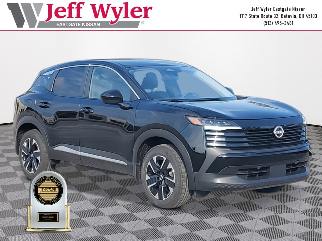 Super Black 2026 Nissan Kicks SV 2.0L DOHC AWD CVT with Xtronic 27/34 City/Highway MPG Jeff Wyler Eastgate Auto Mall is pleased to offer this good-looking 2026 Nissan Kicks SV in Super Black. Well equipped with: 17" Alloy Wheels, 4 Speakers, 4-Wheel Disc Brakes, ABS brakes, Air Conditioning, Alloy wheels, AM/FM radio, Auto High-beam Headlights, Automatic temperature control, AWD Cargo Mat, Blind Spot Warning, Brake assist, Bumpers: body-color, Carpeted Floor Mats, Cloth Seat Trim, Driver door bin, Driver vanity mirror, Dual front impact airbags, Dual front side impact airbags, Electronic Stability Control, Emergency communication system, Exterior Parking Camera Rear, Four wheel independent suspension, Front anti-roll bar, Front Bucket Seats, Front Center Armrest, Front reading lights, Fully automatic headlights, Illuminated entry, Knee airbag, Low tire pressure warning, NissanConnect featuring Apple CarPlay and Android Auto, Occupant sensing airbag, Outside temperature display, Overhead airbag, Panic alarm, Passenger door bin, Passenger vanity mirror, Power door mirrors, Power steering, Power windows, Radio data system, Radio: AM/FM/SiriusXM Audio System, Rear anti-roll bar, Rear reading lights, Rear side impact airbag, Rear window defroster, Rear window wiper, Remote keyless entry, Security system, Speed control, Speed-sensing steering, Splash Guards, Split folding rear seat, Spoiler, Sport steering wheel, Steering wheel mounted audio controls, Tachometer, Telescoping steering wheel, Tilt steering wheel, Traction control, Trip computer, and Variably intermittent wipers. 27/34 City/Highway MPG Price includes: $1000 - Nissan Customer Cash. Exp. 02/02/2026 $500 - Nissan MWR MY26 Kicks Bonus Cash - January . Exp. 02/02/2026