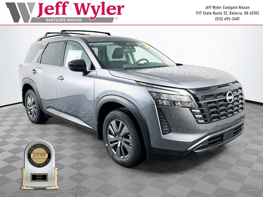 Priced below KBB Fair Purchase Price! Gun Metallic 2026 Nissan Pathfinder SV 3.5L V6 DOHC 4WD 9-Speed Automatic 21/27 City/Highway MPG Jeff Wyler Eastgate Auto Mall is delighted to offer this great 2026 Nissan Pathfinder SV in Gun Metallic. Well equipped with: 18" Painted Alloy Wheels, 3rd row seats: bench, 4-Piece Black Splash Guards, 4-Wheel Disc Brakes, 6 Speakers, ABS brakes, Air Conditioning, Alloy wheels, AM/FM radio: SiriusXM w/360L, Auto High-beam Headlights, Automatic temperature control, Bench Seat Carpeted Floor Mats, Brake assist, Bumpers: body-color, Cloth Seating Surfaces, Cross Bars, Delay-off headlights, Driver door bin, Driver vanity mirror, Dual front impact airbags, Dual front side impact airbags, Electronic Stability Control, Emergency communication system: NissanConnect Services, Four wheel independent suspension, Front anti-roll bar, Front Bucket Seats, Front Center Armrest, Front dual zone A/C, Front reading lights, Fully automatic headlights, Garage door transmitter: myQ Connected Garage, Heated door mirrors, Heated Front Bucket Seats, Heated front seats, Illuminated entry, Knee airbag, Low tire pressure warning, NissanConnect featuring Apple CarPlay and Android Auto, Occupant sensing airbag, Outside temperature display, Overhead airbag, Overhead console, Panic alarm, Passenger door bin, Passenger vanity mirror, Power door mirrors, Power driver seat, Power Liftgate, Power steering, Power windows, Radio data system, Radio: AM/FM Audio System with NissanConnect, Rear air conditioning, Rear anti-roll bar, Rear reading lights, Rear seat center armrest, Rear side impact airbag, Rear window defroster, Rear window wiper, Reclining 3rd row seat, Remote keyless entry, Security system, Speed control, Speed-sensing steering, Split folding rear seat, Spoiler, Steering wheel mounted audio controls, Tachometer, Telescoping steering wheel, Tilt steering wheel, Traction control, Trip computer, and Variably intermittent wipers. 21/27 City/Highway MPG Price includes: $2000 - Nissan Customer Cash. Exp. 03/31/2026