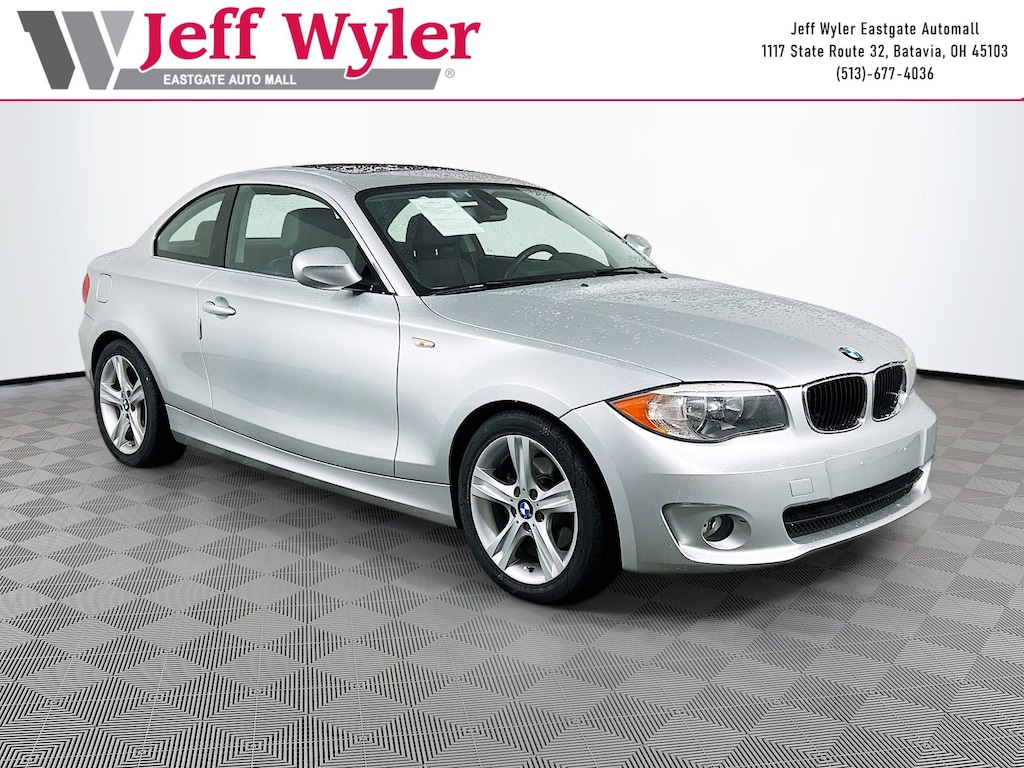 Jeff Wyler Eastgate Auto Mall is honored to offer this superb-looking 2013 BMW 1 Series 128i in Titanium Silver Metallic. Well equipped with: 17" Star-Spoke Light Alloy (Style 262) Wheels, 4-Way Adj. Power Lumbar Support For Front Seats, 4-Wheel Disc Brakes, 6 Speakers, ABS brakes, Air Conditioning, Alloy wheels, AM/FM radio, Ambiance Lighting, Anti-whiplash front head restraints, Auto-Dimming Interior & Exterior Mirrors, Auto-Dimming Rear-View Mirror, Automatic temperature control, BMW Apps, BMW Assist w/Bluetooth®, Brake assist, Bumpers: body-color, CD player, Chrome Line Exterior Trim, Comfort Access Keyless Entry, Delay-off headlights, Driver door bin, Driver vanity mirror, Dual front impact airbags, Dual front side impact airbags, Electronic Stability Control, Floor Mats, Four wheel independent suspension, Front anti-roll bar, Front Bucket Seats, Front Center Armrest w/Storage, Front dual zone A/C, Front fog lights, Front reading lights, Fully automatic headlights, Heated door mirrors, Illuminated entry, Interior Mirror w/Compass, Leather Shift Knob, Light Burl Walnut Trim, Low tire pressure warning, Moonroof, Navigation System, Occupant sensing airbag, Online Information Services, Outside temperature display, Overhead airbag, Passenger door bin, Passenger vanity mirror, Power door mirrors, Power Front Seats w/Driver Memory, Power steering, Power windows, Radio data system, Radio: Anti-Theft AM/FM/HD Stereo CD/MP3 Player, Rain sensing wipers, Real Time Traffic Information, Rear anti-roll bar, Rear window defroster, Remote keyless entry, Satellite Radio, SensaTec Upholstery, Smartphone Integration, Speed control, Speed-sensing steering, Speed-Sensitive Wipers, Split folding rear seat, Sport steering wheel, Steering wheel mounted A/C controls, Steering wheel mounted audio controls, Tachometer, Telescoping steering wheel, Tilt steering wheel, Traction control, Trip computer, Universal Garage-Door Opener, Variably intermittent wipers, and Voice-Command. Reviews: * If you like your driving served "straight up," the 2013 BMW 1 Series is your machine: Front engine, rear-wheel drive, good power and poised handling, all tuned and developed on the assumption you want your car to feel and sound and move just so. Source: KBB.com * Powerful, fuel-efficient engines; rear-wheel drive; nimble handling; solid construction; convertible available. Source: EdmundsAwards: * 2013 KBB.com Brand Image Awards Ask about available certifications. Used vehicles 10 years of age or newer with less than 100,000 miles are eligible for the Wyler Assurance Program, but eligible vehicles must pass our reconditioning process and multi-point inspection. Provided the vehicle passes inspection, vehicles will be eligible for the 6 month/6,000 mile limited warranty. The 6 month/6,000 mile limited warranty is NOT available on AS-IS vehicles, wholesale vehicles, lease buyback/pass-thru vehicles or un-inspected vehicles. Note that this program can also apply to vehicles where the remaining factory coverage is less than 6 months or 6,000 miles. Please check the Federal Trade Commission (FTC) Buyers guide on the vehicle for full details as to whether or not warranty coverage may apply. Contact Dealer for additional details. The Wyler Assurance 6 month/6,000 Mile limited warranty ends 6 months from the date of the Retail Purchase Agreement (BUYERS ORDER) or when the vehicle's odometer registers 6,000 additional miles to the mileage listed on the BUYERS ORDER, whichever comes first. Your Deductible - The warranty holder on your contract pays the first $100 of each covered repair.