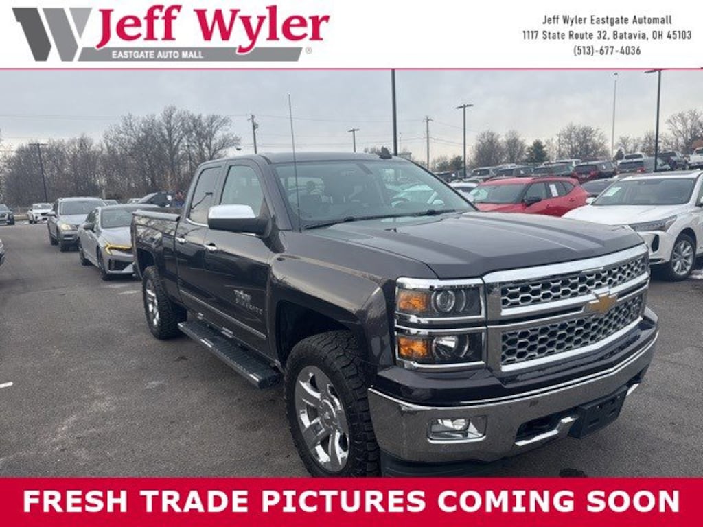 Jeff Wyler Eastgate Auto Mall is excited to offer this fantastic-looking 2015 Chevrolet Silverado 1500 LTZ in Tungsten Metallic. Well equipped with: Trailering Equipment, 110-Volt AC Power Outlet, 150 Amp Alternator, 4-Wheel Disc Brakes, 4.2" Diagonal Color Display Driver Info Center, 40/20/40 Front Split Bench Seat, 6 Speaker Audio System, 6 Speakers, 6" Rectangular Chromed Tubular Assist Steps (LPO), ABS brakes, Air Conditioning, Alloy wheels, AM/FM radio: SiriusXM, Auto-dimming door mirrors, Auto-Dimming Inside Rear-View Mirror, Auto-dimming Rear-View mirror, Automatic temperature control, Auxiliary External Transmission Oil Cooler, Bluetooth® For Phone, Bodyside moldings, Brake assist, Bumpers: chrome, CD player, Chrome Bodyside Moldings, Chrome Cap Power-Adjustable Heated Outside Mirrors, Chrome Door Handles, Chrome Grille w/Chrome Surround, Chrome Mirror Caps, Color-Keyed Carpeting w/Rubberized Vinyl Floor Mats, Compass, Deep-Tinted Glass, Delay-off headlights, Driver & Front Passenger Illuminated Vanity Mirrors, Driver door bin, Driver vanity mirror, Dual front impact airbags, Dual front side impact airbags, Dual-Zone Automatic Climate Control, Electric Rear-Window Defogger, Electronic Stability Control, Emergency communication system: OnStar Directions & Connections, Exterior Parking Camera Rear, EZ Lift & Lower Tailgate, Floor Mounted Console, Front anti-roll bar, Front Center Armrest w/Storage, Front Chrome Bumper, Front dual zone A/C, Front fog lights, Front Full Feature Power Reclining Bucket Seats, Front Halogen Fog Lamps, Front License Plate Kit, Front reading lights, Front wheel independent suspension, Fully automatic headlights, Garage door transmitter, Heated & Cooled Driver & Front Passenger Seats, Heated door mirrors, Heated Driver & Front Passenger Seats, Heated front seats, Heavy-Duty Rear Locking Differential, Illuminated entry, Leather Appointed Seat Trim, Leather Wrapped Steering Wheel w/Cruise Controls, LED Cargo Box Lighting, Low tire pressure warning, Manual Tilt/Telescoping Steering Column, Memory seat, Occupant sensing airbag, OnStar 6 Months Directions & Connections Plan, OnStar w/4G LTE, Outside temperature display, Overhead airbag, Overhead console, Panic alarm, Passenger door bin, Passenger vanity mirror, Power door mirrors, Power driver seat, Power passenger seat, Power Sliding Rear Window w/Defogger, Power steering, Power windows, Power Windows w/Driver Express Up, Premium audio system: Chevrolet MyLink, Radio data system, Radio: AM/FM 8" Diagonal Clr Touch Nav, Radio: AM/FM 8" Diagonal Color Touch Screen, Rear 60/40 Folding Bench Seat (Folds Up), Rear Chrome Bumper, Rear reading lights, Rear step bumper, Rear Vision Camera w/Dynamic Guide Lines, Rear Wheelhouse Liners, Rear window defroster, Remote Keyless Entry, Remote keyless entry, Remote Vehicle Starter System, Security system, Single Slot CD/MP3 Player, SiriusXM Satellite Radio, Speed control, Speed-sensing steering, Split folding rear seat, Steering Wheel Audio Controls, Steering wheel mounted audio controls, Tachometer, Telescoping steering wheel, Theft Deterrent System (Unauthorized Entry), Tilt steering wheel, Traction control, Trip computer, Turn signal indicator mirrors, Universal Home Remote, Variably intermittent wipers, Voltmeter, and Wheels: 20" x 9" Chrome. Clean CARFAX. Reviews: * Powerful, fuel-efficient engines; many available configurations; well-built, comfortable interior; quiet highway ride. Source: Edmunds * If you donât already like the 2015 Silverado for the mere fact that itâs a Chevy, this pickup makes a compelling case for itself with a sophisticated yet intuitive infotainment system, refined interior and an available V8 engine with class-leading power output. Source: KBB.comAsk about available certifications. Used vehicles 10 years of age or newer with less than 100,000 miles are eligible for the Wyler Assurance Program, but eligible vehicles must pass our reconditioning process and multi-point inspect