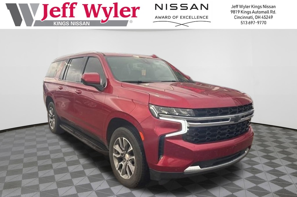 Jeff Wyler Kings Nissan is pleased to offer this fantastic 2022 Chevrolet Suburban LS in Cherry Red Tintcoat. Well equipped with: Driver Alert Package (Lane Change Alert w/Side Blind Zone Alert and Rear Cross Traffic Alert), Preferred Equipment Group 1LS (1st & 2nd Row Color-Keyed Carpeted Floor Mats, Automatic Stop/Start, Color-Keyed Carpeting Floor Covering, Driver & Front Outboard Passenger Airbags, Floor Console w/Storage Area, Front & Rear Park Assist, Leather-Wrapped Steering Wheel, LED Daytime Running Lamps, Remote Start, SiriusXM Radio w/360L, and Start/Stop System Disable Button), 3.23 Rear Axle Ratio, 3rd row seats: split-bench, 4-Wheel Disc Brakes, 6 Speakers, ABS brakes, Air Conditioning, Alloy wheels, AM/FM radio: SiriusXM with 360L, Apple CarPlay/Android Auto, Auto High-beam Headlights, Automatic temperature control, Brake assist, Bumpers: body-color, Compass, Delay-off headlights, Driver door bin, Driver vanity mirror, Dual front impact airbags, Dual front side impact airbags, Electronic Stability Control, Emergency communication system: OnStar and Chevrolet connected services capable, Four wheel independent suspension, Front anti-roll bar, Front Bucket Seats, Front Center Armrest, Front dual zone A/C, Front reading lights, Fully automatic headlights, Heated door mirrors, Illuminated entry, Leather steering wheel, Low tire pressure warning, Not Equipped w/Front & Rear Park Assist, Not Equipped w/Steering Column Lock, Occupant sensing airbag, Outside temperature display, Overhead airbag, Overhead console, Panic alarm, Passenger door bin, Passenger vanity mirror, Power door mirrors, Power driver seat, Power passenger seat, Power steering, Power windows, Premium audio system: Chevrolet Infotainment System 3, Premium Cloth Seat Trim, Premium Smooth Ride Suspension, Radio: Chevrolet Infotainment 3 System, Rain sensing wipers, Rear air conditioning, Rear anti-roll bar, Rear reading lights, Rear seat center armrest, Rear window defroster, Rear window wiper, Remote keyless entry, Roof rack: rails only, Security system, Speed control, Speed-sensing steering, Split folding rear seat, Spoiler, Steering wheel mounted audio controls, Tachometer, Telescoping steering wheel, Tilt steering wheel, Traction control, Trip computer, Variably intermittent wipers, Voltmeter, Wheels: 18" x 8.5" Bright Silver Painted Aluminum, and Wheels: 20" x 9" Painted Aluminum.Ask about available certifications.