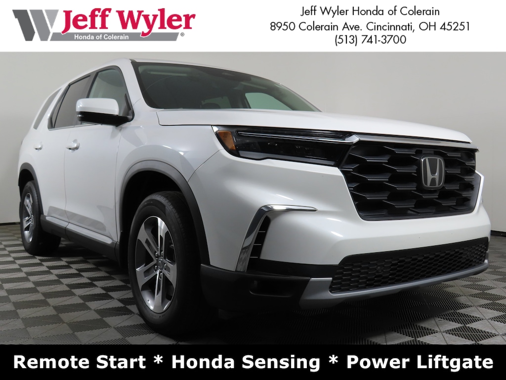 Jeff Wyler Honda of Colerain is proud to offer this good-looking 2023 Honda Pilot EX-L in White. Well equipped with: 3rd row seats: split-bench, 4-Wheel Disc Brakes, 9 Speakers, ABS brakes, Adaptive Cruise Control: Adaptive Cruise Control (ACC) with Low-Speed Follow, Air Conditioning, Alloy wheels, AM/FM radio: SiriusXM, Apple CarPlay/Android Auto, Auto High-beam Headlights, Auto-dimming Rear-View mirror, Automatic temperature control, Axle Ratio: 4.167, Blind Spot Information (BSI) System warning, Brake assist, Bumpers: body-color, Delay-off headlights, Driver door bin, Driver vanity mirror, Dual front impact airbags, Dual front side impact airbags, Electronic Stability Control, Emergency communication system: HondaLink Assist, Four wheel independent suspension, Front anti-roll bar, Front Bucket Seats, Front Center Armrest, Front dual zone A/C, Front fog lights, Front reading lights, Fully automatic headlights, Garage door transmitter: HomeLink, Heated door mirrors, Heated Front Bucket Seats, Heated front seats, Illuminated entry, Knee airbag, Lane departure: Lane Keeping Assist System (LKAS) active, Leather Seat Trim, Low tire pressure warning, Memory seat, Occupant sensing airbag, Outside temperature display, Overhead airbag, Overhead console, Panic alarm, Passenger door bin, Passenger vanity mirror, Power door mirrors, Power driver seat, Power Liftgate, Power passenger seat, Power steering, Power windows, Radio data system, Radio: 245-Watt Audio System, Rear air conditioning, Rear anti-roll bar, Rear reading lights, Rear window defroster, Rear window wiper, Reclining 3rd row seat, Remote keyless entry, Security system, Speed control, Speed-sensing steering, Speed-Sensitive Wipers, Split folding rear seat, Spoiler, Steering wheel mounted audio controls, Tachometer, Telescoping steering wheel, Tilt steering wheel, Traction control, Trip computer, Turn signal indicator mirrors, Variably intermittent wipers, and Wheels: 18" Machined Face Pewter Gray.