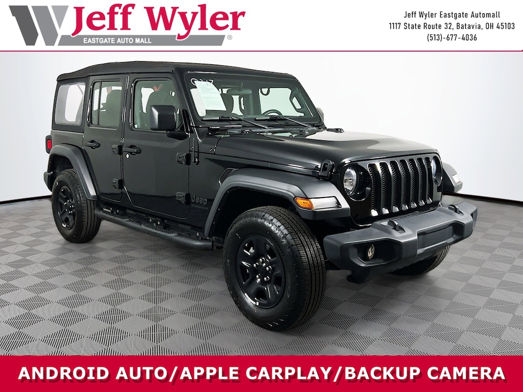 Jeff Wyler Eastgate Auto Mall is excited to offer this wonderful-looking 2023 Jeep Wrangler Sport in Black Clearcoat. Well equipped with: Quick Order Package 22B Sport, 3.45 Overall Top Gear Ratio, 4-Wheel Disc Brakes, 8 Speakers, ABS brakes, Air Conditioning, AM/FM radio, Apple CarPlay, Apple CarPlay/Android Auto, Aux Battery, Brake assist, Cloth Low-Back Bucket Seats, Compass, Delay-off headlights, Driver door bin, Driver vanity mirror, Dual front impact airbags, Dual front side impact airbags, Electronic Stability Control, Emergency communication system: SiriusXM Guardian, Engine Oil Cooler, Front anti-roll bar, Front Bucket Seats, Front Center Armrest w/Storage, Front fog lights, Front reading lights, Google Android Auto, GPS Antenna Input, Integrated Center Stack Radio, Integrated roll-over protection, Integrated Voice Command w/Bluetooth, Low tire pressure warning, MOPAR All-Weather Floor Mats, Non-Lock Fuel Cap w/o Discriminator, Normal Duty Suspension, Occupant sensing airbag, Outside temperature display, ParkView Rear Back-Up Camera, Passenger door bin, Passenger vanity mirror, Power steering, Radio data system, Radio: Uconnect 4 w/7" Display, Rear anti-roll bar, Rear reading lights, Speed control, Split folding rear seat, Steering wheel mounted audio controls, Stop-Start Dual Battery System, Tachometer, Telescoping steering wheel, Tilt steering wheel, Traction control, Trip computer, USB Host Flip, Variably intermittent wipers, and Wheels: 17" x 7.5" Black Steel Styled. Clean CARFAX. Ask about available certifications. Used vehicles 10 years of age or newer with less than 100,000 miles are eligible for the Wyler Assurance Program, but eligible vehicles must pass our reconditioning process and multi-point inspection. Provided the vehicle passes inspection, vehicles will be eligible for the 6 month/6,000 mile limited warranty. The 6 month/6,000 mile limited warranty is NOT available on AS-IS vehicles, wholesale vehicles, lease buyback/pass-thru vehicles or un-inspected vehicles. Note that this program can also apply to vehicles where the remaining factory coverage is less than 6 months or 6,000 miles. Please check the Federal Trade Commission (FTC) Buyers guide on the vehicle for full details as to whether or not warranty coverage may apply. Contact Dealer for additional details. The Wyler Assurance 6 month/6,000 Mile limited warranty ends 6 months from the date of the Retail Purchase Agreement (BUYERS ORDER) or when the vehicle's odometer registers 6,000 additional miles to the mileage listed on the BUYERS ORDER, whichever comes first. Your Deductible - The warranty holder on your contract pays the first $100 of each covered repair.