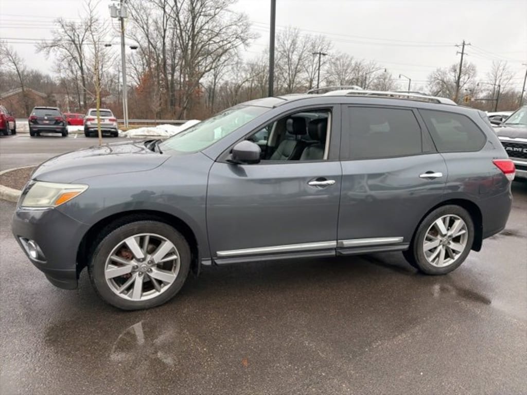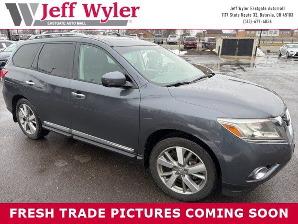 Jeff Wyler Eastgate Auto Mall is proud to offer this fantastic 2013 Nissan Pathfinder Platinum in Dark Slate. Well equipped with: 13 Speakers, 20" Wheels, 3rd row seats: bench, 4-Wheel Disc Brakes, 5.577 Axle Ratio, ABS brakes, Air Conditioning, Alloy wheels, AM/FM radio: SiriusXM, Auto tilt-away steering wheel, Auto-dimming Rear-View mirror, Automatic temperature control, Bodyside moldings, Brake assist, Bumpers: body-color, CD player, Driver door bin, Driver vanity mirror, Dual front impact airbags, Dual front side impact airbags, DVD-Audio, Electronic Stability Control, Exterior Parking Camera Rear, Four wheel independent suspension, Front anti-roll bar, Front Bucket Seats, Front Center Armrest w/Storage, Front dual zone A/C, Front fog lights, Front reading lights, Fully automatic headlights, Garage door transmitter: HomeLink, Heated & Cooled Climate Controlled Seats, Heated door mirrors, Heated front seats, Heated rear seats, Heated steering wheel, Illuminated entry, Leather Seating Surfaces, Leather Shift Knob, Leather steering wheel, Low tire pressure warning, Memory seat, Navigation System, Occupant sensing airbag, Outside temperature display, Overhead airbag, Overhead console, Panic alarm, Passenger door bin, Passenger vanity mirror, Power door mirrors, Power driver seat, Power Liftgate, Power passenger seat, Power steering, Power windows, Radio data system, Radio: Bose Audio System w/AM/FM/CD & 13 Speakers, Rear air conditioning, Rear anti-roll bar, Rear reading lights, Rear seat center armrest, Rear window defroster, Rear window wiper, Reclining 3rd row seat, Remote keyless entry, Roof rack: rails only, Security system, Speed control, Speed-sensing steering, Speed-Sensitive Wipers, Split folding rear seat, Spoiler, Steering wheel memory, Steering wheel mounted audio controls, Tachometer, Telescoping steering wheel, Tilt steering wheel, Traction control, Trip computer, Variably intermittent wipers, Ventilated front seats, Voltmeter, and Wheels: 20" Unique Metallic Paint Finish Alloy. Awards: * 2013 KBB.com 10 Best Family Cars Ask about available certifications. Used vehicles 10 years of age or newer with less than 100,000 miles are eligible for the Wyler Assurance Program, but eligible vehicles must pass our reconditioning process and multi-point inspection. Provided the vehicle passes inspection, vehicles will be eligible for the 6 month/6,000 mile limited warranty. The 6 month/6,000 mile limited warranty is NOT available on AS-IS vehicles, wholesale vehicles, lease buyback/pass-thru vehicles or un-inspected vehicles. Note that this program can also apply to vehicles where the remaining factory coverage is less than 6 months or 6,000 miles. Please check the Federal Trade Commission (FTC) Buyers guide on the vehicle for full details as to whether or not warranty coverage may apply. Contact Dealer for additional details. The Wyler Assurance 6 month/6,000 Mile limited warranty ends 6 months from the date of the Retail Purchase Agreement (BUYERS ORDER) or when the vehicle's odometer registers 6,000 additional miles to the mileage listed on the BUYERS ORDER, whichever comes first. Your Deductible - The warranty holder on your contract pays the first $100 of each covered repair.