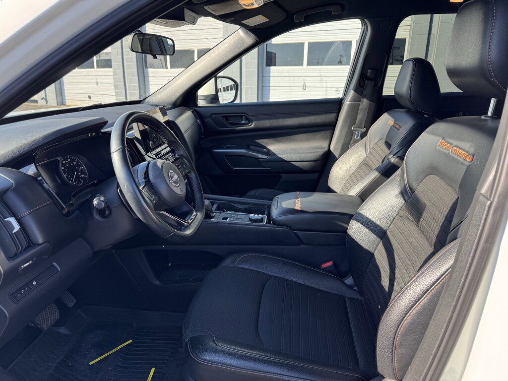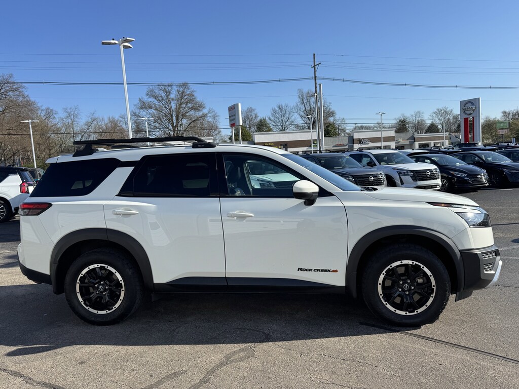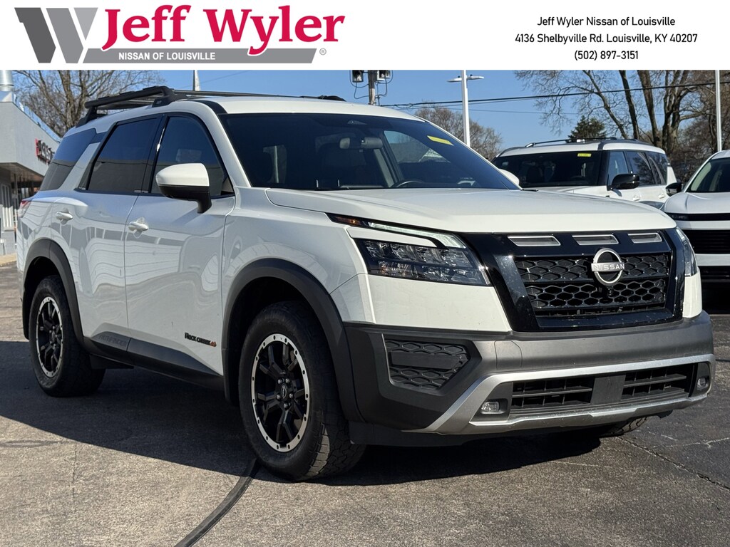 Jeff Wyler Nissan of Louisville is very proud to offer this wonderful-looking 2023 Nissan Pathfinder Rock Creek in Glacier White. ** ALL WHEEL DRIVE/AWD **, ** BLUETOOTH **, ** BACKUP CAMERA **, ** PUSH-BUTTON START **, ** 6-CYLINDER ENGINE **, ** LOCALLY OWNED **, and ** HOME DELIVERY OPTIONS! ** 4WD, 3rd row seats: bench, 4-Wheel Disc Brakes, 6 Speakers, ABS brakes, Air Conditioning, Alloy wheels, AM/FM radio: SiriusXM, Auto High-beam Headlights, Automatic temperature control, Axle Ratio: 4.334, Black Splash Guards (Set of 4), Brake assist, Delay-off headlights, Driver door bin, Driver vanity mirror, Dual front impact airbags, Dual front side impact airbags, Electronic Stability Control, Emergency communication system: NissanConnect Services, Four wheel independent suspension, Front anti-roll bar, Front Bucket Seats, Front Center Armrest, Front dual zone A/C, Front fog lights, Front reading lights, Fully automatic headlights, Heated door mirrors, Heated Front Bucket Seats, Heated front seats, Illuminated entry, Knee airbag, Leather steering wheel, Leatherette Seating Surfaces, Low tire pressure warning, NissanConnect featuring Apple CarPlay and Android Auto, Occupant sensing airbag, Outside temperature display, Overhead airbag, Overhead console, Panic alarm, Passenger door bin, Passenger vanity mirror, Power door mirrors, Power driver seat, Power steering, Power windows, Radio data system, Radio: AM/FM Audio System w/NissanConnect, Rear air conditioning, Rear anti-roll bar, Rear Parking Sensors, Rear reading lights, Rear side impact airbag, Rear window defroster, Rear window wiper, Reclining 3rd row seat, Remote keyless entry, Rock Creek AS Floor Liners & Cargo Area Protector, Rock Creek Roof Rack, Roof rack, Security system, Speed control, Speed-sensing steering, Split folding rear seat, Spoiler, Steering wheel mounted audio controls, Tachometer, Telescoping steering wheel, Tilt steering wheel, Traction control, Trip computer, Turn signal indicator mirrors, Variably intermittent wipers, and Wheels: 18" Beadlock Styled Design Our PRE-OWNED vehicles are put through a rigorous 167- POINT QUALITY ASSURANCE INSPECTION along with an average amount of over $1,400.00 SPENT to recondition each vehicle so we can be sure to deliver you the highest quality vehicle like you deserve! ***ONLINE PRICE DOES NOT INCLUDE WYLER FAMILY FIRST PACKAGE*** Stop by 4136 Shelbyville Road to see for yourself, or give us a call @ 502-897-3151 to schedule your test drive! ** ALL WHEEL DRIVE/AWD **, ** BLUETOOTH **, ** BACKUP CAMERA **, ** PUSH-BUTTON START **, ** 6-CYLINDER ENGINE **, ** LOCALLY OWNED **, 4WD, 3rd row seats: bench, 4-Wheel Disc Brakes, 6 Speakers, ABS brakes, Air Conditioning, Alloy wheels, AM/FM radio: SiriusXM, Auto High-beam Headlights, Automatic temperature control, Axle Ratio: 4.334, Black Splash Guards (Set of 4), Brake assist, Delay-off headlights, Driver door bin, Driver vanity mirror, Dual front impact airbags, Dual front side impact airbags, Electronic Stability Control, Emergency communication system: NissanConnect Services, Four wheel independent suspension, Front anti-roll bar, Front Bucket Seats, Front Center Armrest, Front dual zone A/C, Front fog lights, Front reading lights, Fully automatic headlights, Heated door mirrors, Heated Front Bucket Seats, Heated front seats, Illuminated entry, Knee airbag, Leather steering wheel, Leatherette Seating Surfaces, Low tire pressure warning, NissanConnect featuring Apple CarPlay and Android Auto, Occupant sensing airbag, Outside temperature display, Overhead airbag, Overhead console, Panic alarm, Passenger door bin, Passenger vanity mirror, Power door mirrors, Power driver seat, Power steering, Power windows, Radio data system, Radio: AM/FM Audio System w/NissanConnect, Rear air conditioning, Rear anti-roll bar, Rear Parking Sensors, Rear reading lights, Rear side impact airbag, Rear window defroster, Rear window wiper, Reclining 3rd row seat, Remote keyless entry, Rock Creek AS Fl
