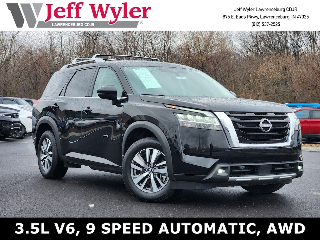 Jeff Wyler Chrysler Dodge Jeep of Lawrenceburg is excited to offer this fantastic 2024 Nissan Pathfinder SL in Super Black. 4WD, 3rd row seats: bench, 4-Wheel Disc Brakes, 6 Speakers, ABS brakes, Air Conditioning, Alloy wheels, AM/FM radio: SiriusXM, Auto High-beam Headlights, Auto-dimming Rear-View mirror, Automatic temperature control, Axle Ratio: 4.334, Bench Seat Carpeted Floor Mats (Set of 4), Black Splash Guards (Set of 4), Brake assist, Bumpers: body-color, Cross Bars, Delay-off headlights, Driver door bin, Driver vanity mirror, Dual front impact airbags, Dual front side impact airbags, Electronic Stability Control, Emergency communication system, Exterior Parking Camera Rear, Four wheel independent suspension, Front anti-roll bar, Front Bucket Seats, Front Center Armrest, Front dual zone A/C, Front reading lights, Fully automatic headlights, Garage door transmitter: HomeLink, Heated door mirrors, Heated Front Bucket Seats, Heated front seats, Heated steering wheel, Illuminated entry, Knee airbag, Leather steering wheel, Leather-Appointed Seating Surfaces, LED Fog Lamps, Low tire pressure warning, Navigation system: NissanConnect with Navigation and Services, NissanConnect featuring Apple CarPlay and Android Auto, NissanConnect w/Navigation & Services, Occupant sensing airbag, Outside temperature display, Overhead airbag, Overhead console, Panic alarm, Passenger door bin, Passenger vanity mirror, Power door mirrors, Power driver seat, Power Liftgate, Power passenger seat, Power steering, Power windows, Radio data system, Radio: AM/FM Audio System, Rear air conditioning, Rear anti-roll bar, Rear reading lights, Rear seat center armrest, Rear side impact airbag, Rear window defroster, Rear window wiper, Reclining 3rd row seat, Remote keyless entry, Security system, Speed control, Speed-sensing steering, Split folding rear seat, Spoiler, Steering wheel mounted audio controls, Tachometer, Telescoping steering wheel, Tilt steering wheel, Traction control, Trip computer, Turn signal indicator mirrors, Variably intermittent wipers, and Wheels: 18" x 8J Machined Alloy Our PRE-OWNED vehicles are put through a rigorous 167- POINT QUALITY ASSURANCE INSPECTION along with an average amount of over $1,400.00 SPENT to recondition each vehicle so we can be sure to deliver you the highest quality vehicle like you deserve! ***ONLINE PRICE DOES NOT INCLUDE WYLER FAMILY FIRST PACKAGE*** Stop by 4136 Shelbyville Road to see for yourself, or give us a call @ 502-897-3151 to schedule your test drive! Ask about available certifications.