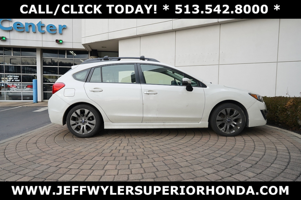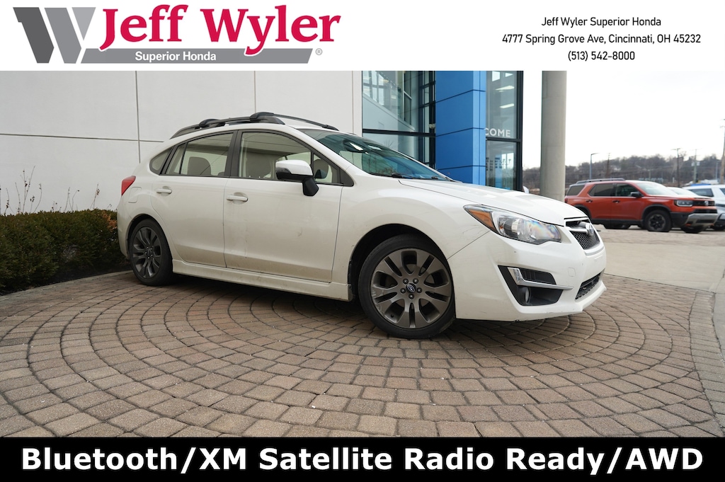 Jeff Wyler Superior Honda is honored to offer this wonderful-looking 2016 Subaru Impreza 2.0i Sport Premium in Crystal White Pearl. BLUETOOTH Impreza 2.0i Sport Premium, 4D Hatchback, 2.0L 4-Cylinder DOHC 16V, 5-Speed Manual, AWD, Crystal White Pearl, Black Cloth, 4-Wheel Disc Brakes, 6 Speakers, ABS brakes, Air Conditioning, Alloy wheels, AM/FM radio, Brake assist, Bumpers: body-color, Cargo Tray, CD player, Driver door bin, Driver vanity mirror, Dual front impact airbags, Dual front side impact airbags, Electronic Stability Control, Emergency communication system, Exterior Parking Cameras, Four wheel independent suspension, Front anti-roll bar, Front Bucket Seats, Front Center Armrest, Front fog lights, Front reading lights, Heated door mirrors, Heated front seats, Heated Reclining Front Bucket Seats, Illuminated entry, Knee airbag, Leather Shift Knob, Leather steering wheel, Low tire pressure warning, Occupant sensing airbag, Outside temperature display, Overhead airbag, Panic alarm, Passenger door bin, Passenger vanity mirror, Power door mirrors, Power steering, Power windows, Radio data system, Radio: Subaru Starlink 6.2" Multimedia System, Rear anti-roll bar, Rear Bumper Applique, Rear window defroster, Rear window wiper, Remote keyless entry, Roof rack: rails only, Security system, Speed control, Speed-sensing steering, Split folding rear seat, Spoiler, Sport Fabric Upholstery, Steering wheel mounted audio controls, Tachometer, Telescoping steering wheel, Tilt steering wheel, Traction control, Trip computer, Turn signal indicator mirrors, Variably intermittent wipers, and Wheels: 17" x 7.0JJ Gray Finish Aluminum Alloy Our PRE-OWNED vehicles are put through a rigorous 167- POINT QUALITY ASSURANCE INSPECTION along with an average amount of over $1,400.00 SPENT to recondition each vehicle so we can be sure to deliver you the highest quality vehicle like you deserve! ***ONLINE PRICE DOES NOT INCLUDE WYLER FAMILY FIRST PACKAGE*** Stop by 4777 Spring Grove Ave. Road to see for yourself, or give us a call @ 283-209-1858 to schedule your test drive!