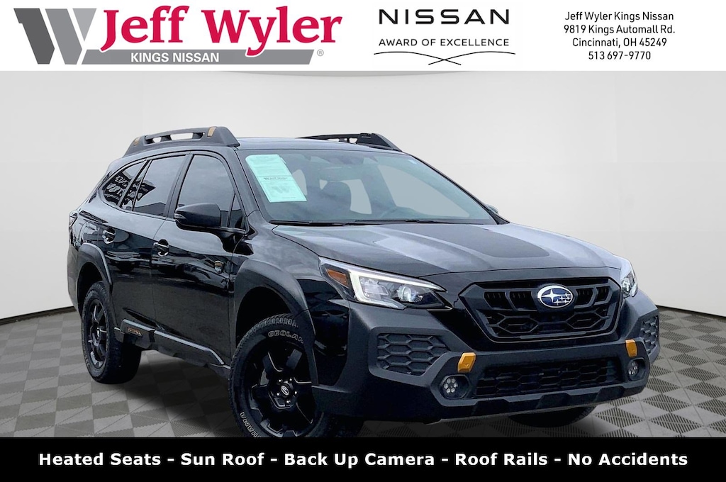 Jeff Wyler Kings Nissan is pleased to offer this wonderful 2024 Subaru Outback Wilderness in Crystal Black Silica. Well equipped with: Power Moonroof & Navigation & RAB (Power Moonroof, Radio: Subaru STARLINK 11.6" Multimedia Nav System, and Reverse Automatic Braking (RAB) System), 12 Speakers, 4-Wheel Disc Brakes, 4.444 Axle Ratio, ABS brakes, Air Conditioning, Alloy wheels, AM/FM radio: SiriusXM, Auto High-beam Headlights, Auto-Dimming Exterior Mirror w/Approach Light, Auto-dimming Rear-View mirror, Automatic temperature control, Brake assist, Carpeted Floor Mats, Compass, Driver door bin, Driver vanity mirror, Dual front impact airbags, Dual front side impact airbags, Electronic Stability Control, Emergency communication system: STARLINK Safety Plus (3-year free trial), Exterior Parking Camera Rear, Four wheel independent suspension, Front anti-roll bar, Front Bucket Seats, Front Center Armrest w/Storage, Front dual zone A/C, Front fog lights, Front reading lights, Fully automatic headlights, Garage door transmitter: HomeLink, harman/kardon® Speakers, Heated door mirrors, Heated Front Bucket Seats, Heated front seats, Heated rear seats, Heated steering wheel, Illuminated entry, Knee airbag, Leather steering wheel, LED Upgrade, Low tire pressure warning, Occupant sensing airbag, Outside temperature display, Overhead airbag, Overhead console, Panic alarm, Passenger door bin, Passenger vanity mirror, Power door mirrors, Power driver seat, Power Liftgate, Power passenger seat, Power steering, Power windows, Radio: Subaru STARLINK 11.6" Multimedia Plus Sys, Rear anti-roll bar, Rear Seat Back Protector, Rear seat center armrest, Rear window defroster, Rear window wiper, Remote keyless entry, Roof rack, Security system, Speed control, Speed-sensing steering, Split folding rear seat, Spoiler, StarTex-Trimmed Upholstery, Steering wheel mounted audio controls, Tachometer, Telescoping steering wheel, Tilt steering wheel, Traction control, Trip computer, Turn signal indicator mirrors, Variably intermittent wipers, and Wheels: 17" x 7J Matte Black Aluminum-Alloy.Ask about available certifications.