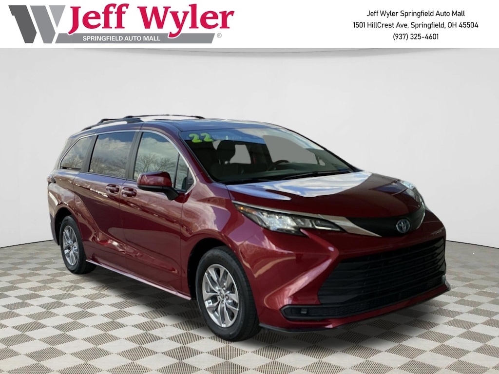 Jeff Wyler Springfield Auto Mall is very proud to offer this stunning 2022 Toyota Sienna LE in Red. Well equipped with: 17" Alloy Wheels, 3rd row seats: split-bench, 4-Wheel Disc Brakes, 6 Speakers, ABS brakes, Air Conditioning, Alloy wheels, AM/FM radio: SiriusXM, Apple CarPlay/Android Auto, Auto High-beam Headlights, Auto-dimming door mirrors, Automatic temperature control, Axle Ratio: TBA, Brake assist, Bumpers: body-color, Compass, Delay-off headlights, Door auto-latch, Driver door bin, Driver vanity mirror, Driver's Seat Mounted Armrest, Dual front impact airbags, Dual front side impact airbags, Electronic Stability Control, Emergency communication system: Safety Connect with 1-year trial, Exterior Parking Camera Rear, Fabric Seat Material, Four wheel independent suspension, Front anti-roll bar, Front Bucket Seats, Front dual zone A/C, Front reading lights, Fully automatic headlights, Heated door mirrors, Illuminated entry, Knee airbag, Lane Departure Warning System, Low tire pressure warning, Occupant sensing airbag, Outside temperature display, Overhead airbag, Overhead console, Panic alarm, Passenger door bin, Passenger seat mounted armrest, Passenger vanity mirror, Power door mirrors, Power driver seat, Power steering, Power windows, Radio data system, Radio: Audio System, Rear air conditioning, Rear anti-roll bar, Rear reading lights, Rear seat center armrest, Rear side impact airbag, Rear window defroster, Rear window wiper, Reclining 3rd row seat, Remote keyless entry, Speed control, Speed-sensing steering, Split folding rear seat, Spoiler, Steering wheel mounted audio controls, Tachometer, Telescoping steering wheel, Tilt steering wheel, Traction control, Trip computer, Turn signal indicator mirrors, and Variably intermittent wipers. Ask about available certifications. Used vehicles 10 years of age or newer with less than 100,000 miles are eligible for the Wyler Assurance Program, but eligible vehicles must pass our reconditioning process and multi-point inspection. Provided the vehicle passes inspection, vehicles will be eligible for the 6 month/6,000 mile limited warranty. The 6 month/6,000 mile limited warranty is NOT available on AS-IS vehicles, wholesale vehicles, lease buyback/pass-thru vehicles or un-inspected vehicles. Note that this program can also apply to vehicles where the remaining factory coverage is less than 6 months or 6,000 miles. Please check the Federal Trade Commission (FTC) Buyers guide on the vehicle for full details as to whether or not warranty coverage may apply. Contact Dealer for additional details. The Wyler Assurance 6 month/6,000 Mile limited warranty ends 6 months from the date of the Retail Purchase Agreement (BUYERS ORDER) or when the vehicle's odometer registers 6,000 additional miles to the mileage listed on the BUYERS ORDER, whichever comes first. Your Deductible - The warranty holder on your contract pays the first $100 of each covered repair.